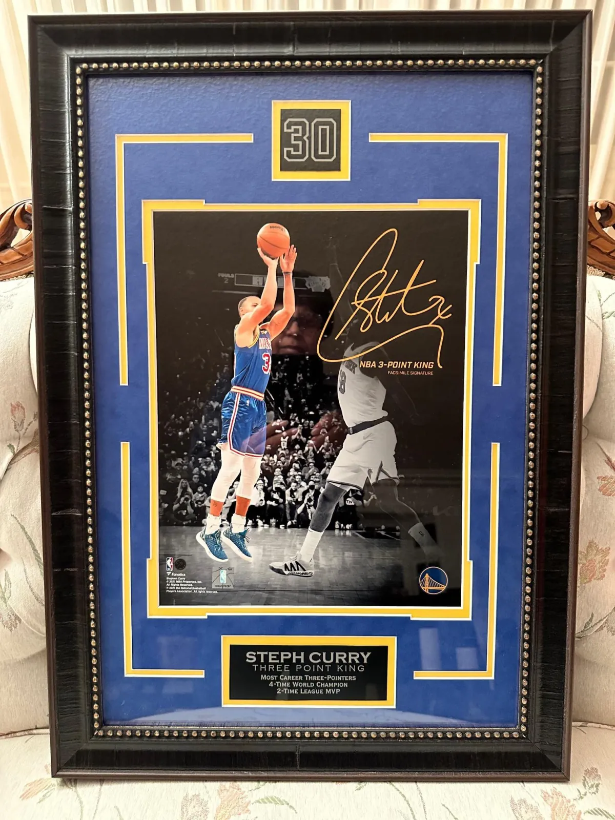 Framed 24" x 24" signed photo in glass frame of Stephen Curry, four-time NBA Champion and two-time MVP—perfect for any Golden State Warriors basketball fan.
