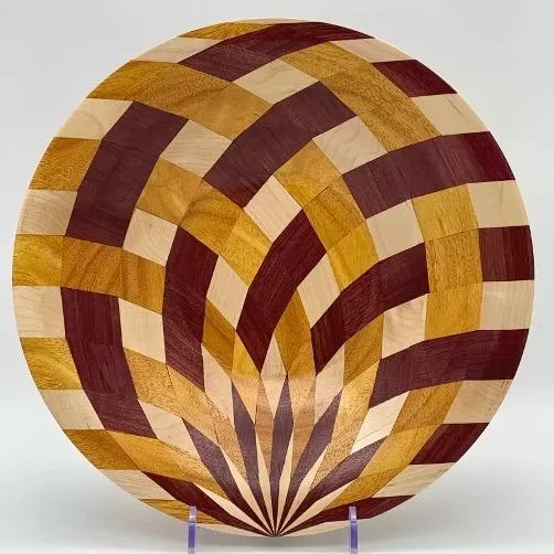 A stunning one-of-a-kind turned wood bowl by artisan Steve, crafted from natural-colored woods and finished by hand with Tung Oil for a warm, lustrous glow. Known for his precise, illusionary designs, Steve creates pieces that intrigue both art lovers and fellow woodworkers alike.