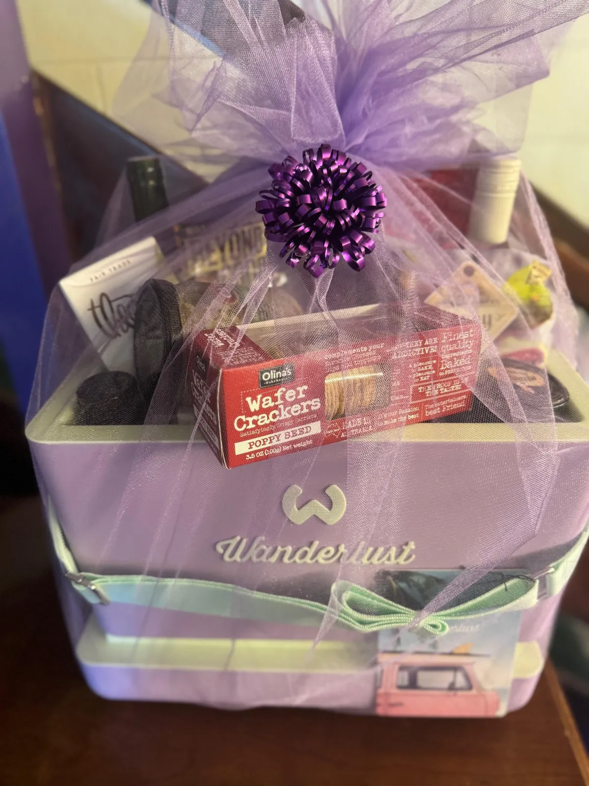 A vibrant cooler packed with organic wine, chocolate, pasta, sauces, sundried tomatoes, hot honey, pepper jam, crackers, nuts, bruschetta, cured meats, cutting boards—and a $100 Grocery Outlet gift card. Donated with heart by Chanta & Bruce Vath.