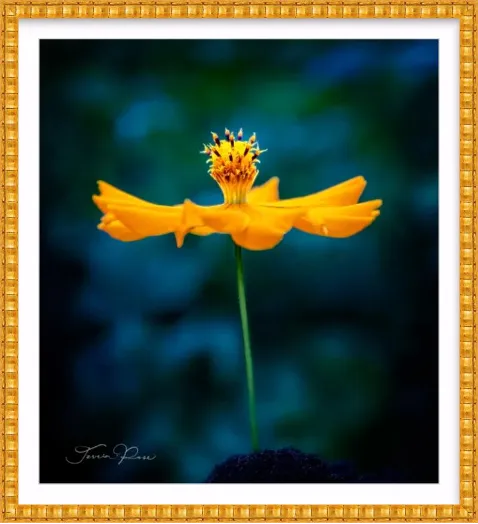 A single sulfur cosmos sways like a ballerina in bloom—its golden heart and delicate petals dancing against a soft blue sky. A quiet celebration of nature’s grace.