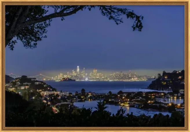 San Francisco glows like a constellation above the Bay—its iconic skyline reflected in tranquil waters, framed by the quiet lights of Marin. A luminous portrait of twilight’s embrace.